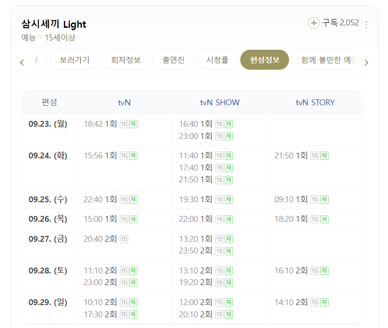 <삼시세끼 라이트>의 ott는 티빙으로 1화의 재방송 일정은 아래와 같다