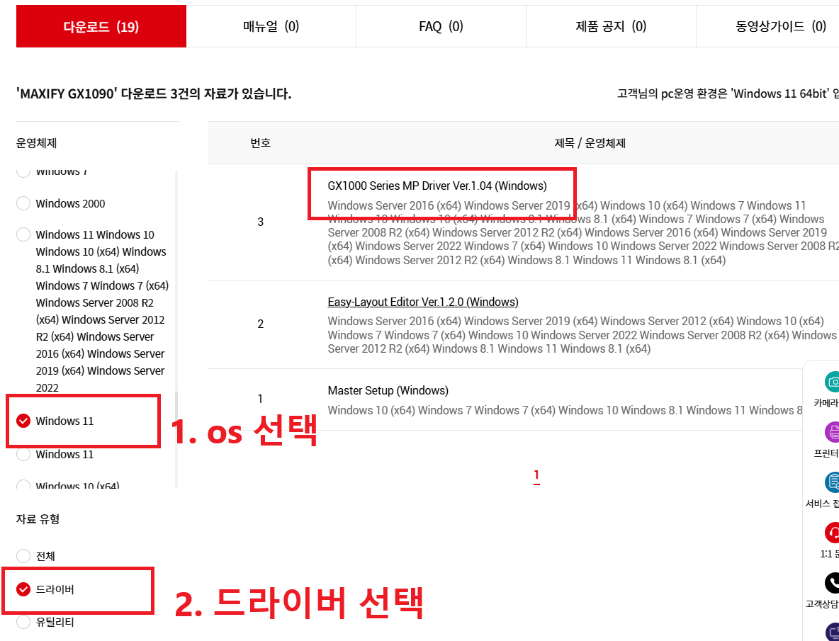 사용 중인 컴퓨터의 운영체제(예: Windows 10, macOS)를 선택합니다. 운영체제를 정확히 선택해야 호환되는 드라이버를 받을 수 있습니다.