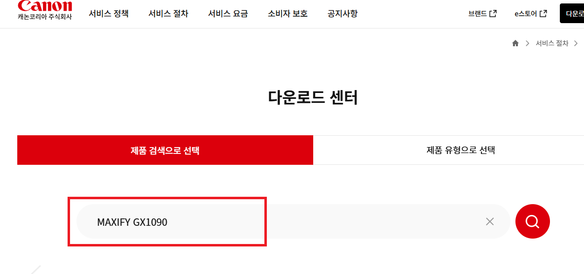 검색창에 'GX1090'을 입력하고 검색합니다. 검색 결과에서 'MAXIFY GX1090' 모델을 선택합니다.