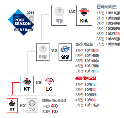 KIA 타이거즈, 삼성 라이온즈, LG 트윈스, 두산 베어스, 그리고 KT 위즈가 올해 포스트시즌에 진출한 팀들로, 이들은 한국시리즈 우승을 향한 여정을 시작합니다.