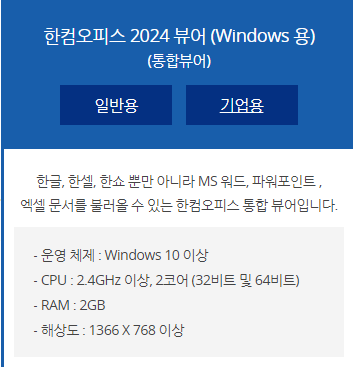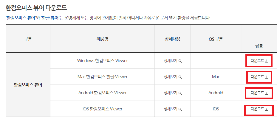 본인의 운영체제에 맞는 한글 뷰어 버전을 선택하고 다운로드 버튼을 클릭하세요.