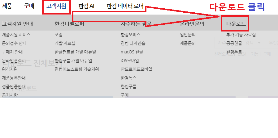페이지 상단 메뉴 고객지원 > 다운로드로 를 선택하여 다운로드 페이지로 이동합니다.