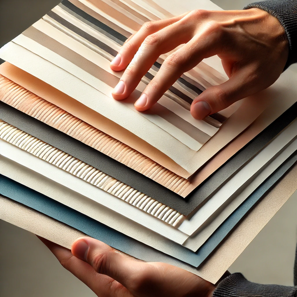 고급 질감 용지: 패브릭 또는 유사한 질감이 느껴지는 용지입니다. 일반적인 사무용도보다는 초대장, 연하장 같은 특별한 인쇄물에 적합해요. 촉감에서부터 고급스러움을 느낄 수 있어 중요한 행사나 고급스러운 느낌을 주고 싶을 때 사용됩니다. 필기감이 좋아서 필기용으로도 많이 쓰여요.